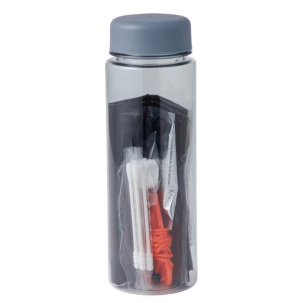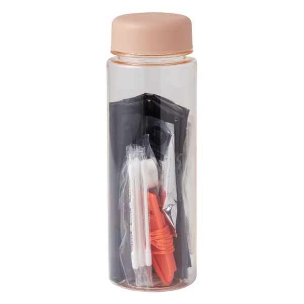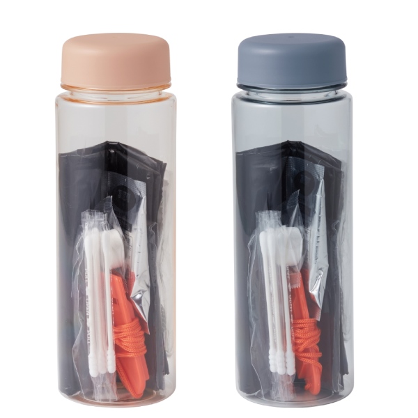 コンパクトでかさばらないボトルに必要最低限の防災グッズが入っています。