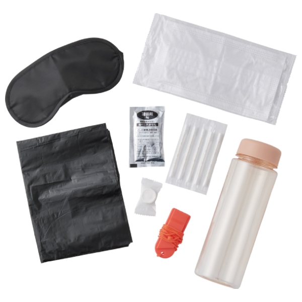 凝固剤、汚物専用ポリ袋、アイマスク、マスク、圧縮タオル、綿棒5本、ホイッスル