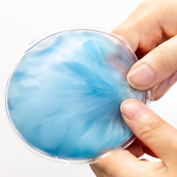 カイロの中の金属プレートを数回パチッと押し曲げると液体が結晶化し発熱します。