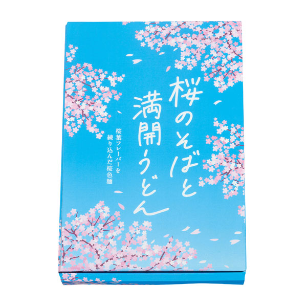 澄んだ青空に桜の花びらが舞い散る、華やかさとはかなさを表現したパッケージデザインが「エモい」桜そばとうどんのセット。
