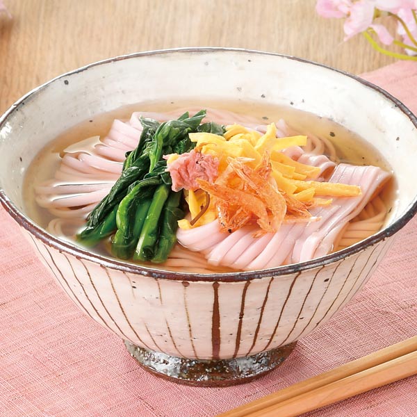 桜うどん調理例(※商品は麺のみになります。お好きな出汁や具材を入れてお召し上がりください。)