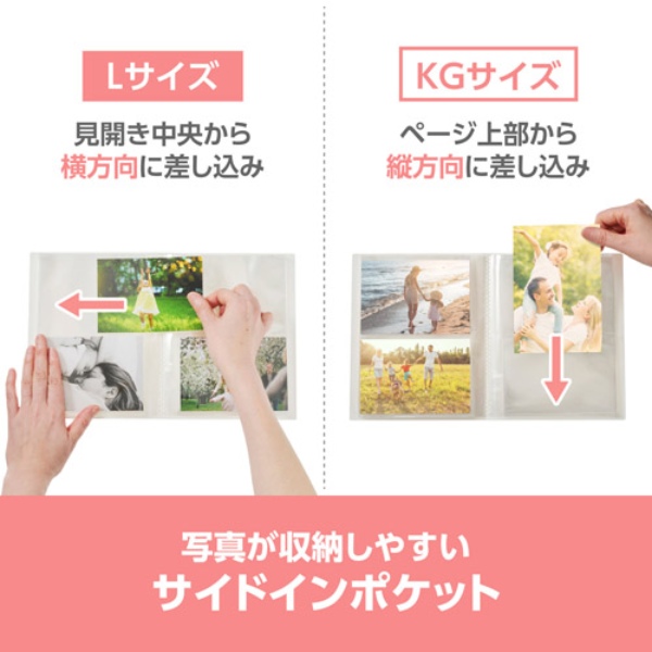Lサイズの写真が横向きに80枚、ハガキサイズの写真なら縦向きに40枚収納できます。