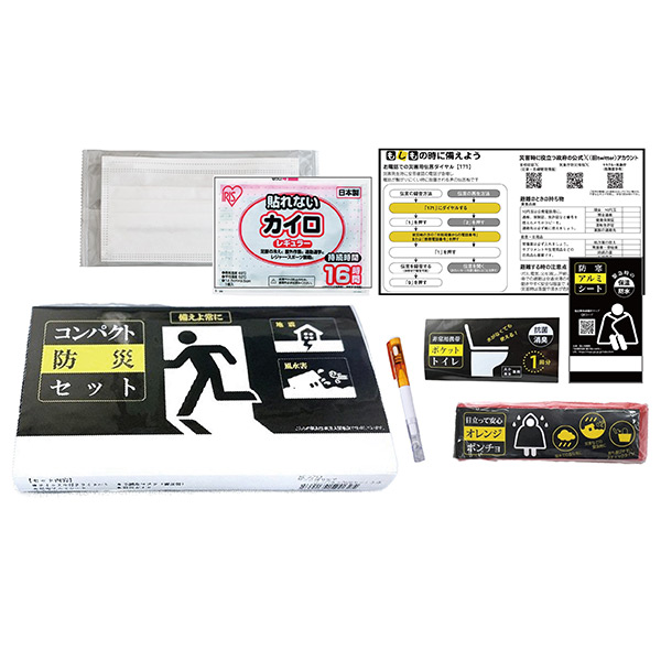 非常用トイレ、オレンジポンチョ、使い捨てカイロ、防災ガイド(表紙底面)