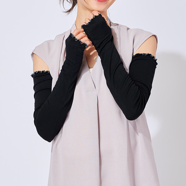 ロング丈で腕をしっかりカバーし、手元のアクセントが女性らしい印象を演出します。