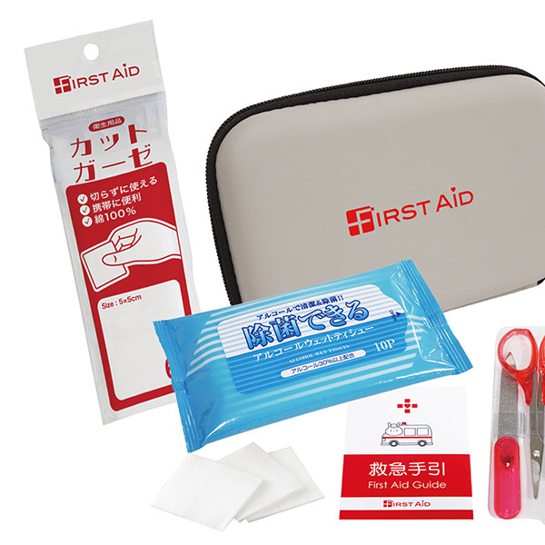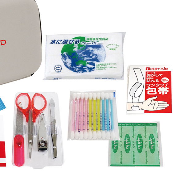 収納ケース、絆創膏5P、ワンタッチ包帯、コットンパフ3P、水に流せるペーパー、救急手引、