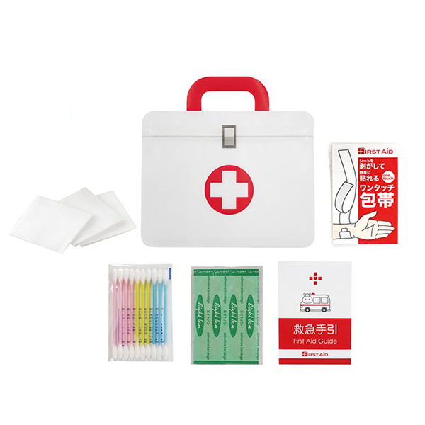 ジッパーポーチ、絆創膏5P、綿棒10P、ワンタッチ包帯、コットンパフ3P、救急手引