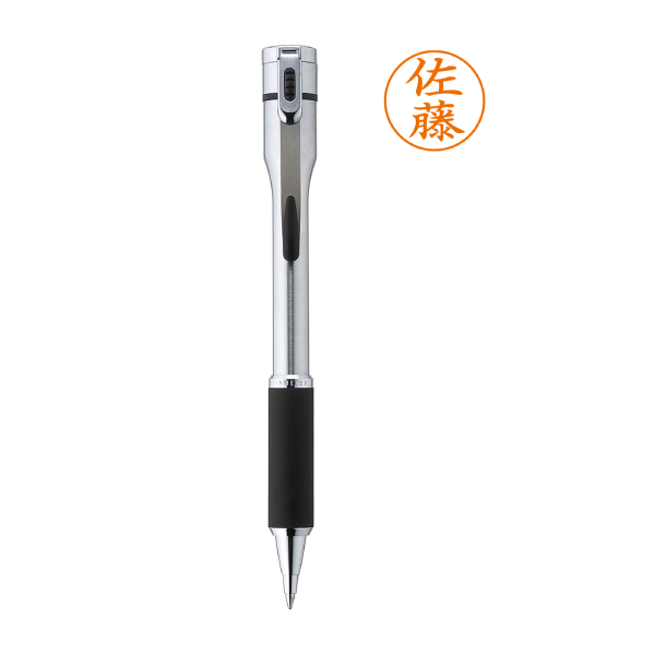 キャップを外す手間なく、「書く」と「捺す」を1本でこなせるネームペンキャップレスSのシルバータイプ。