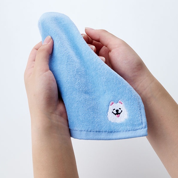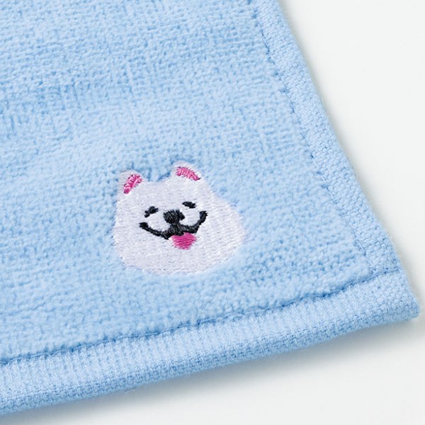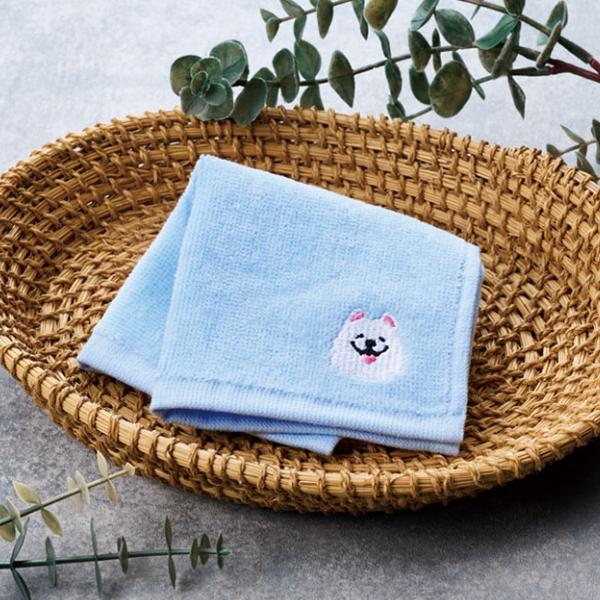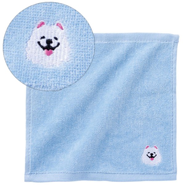 愛らしい表情で親しまれ、近年人気の犬種、サモエドがデザインされたハンドタオルです。