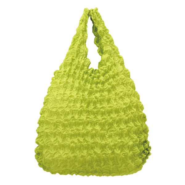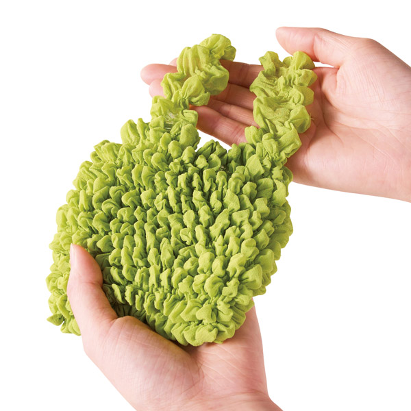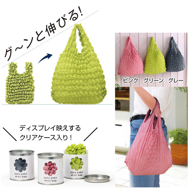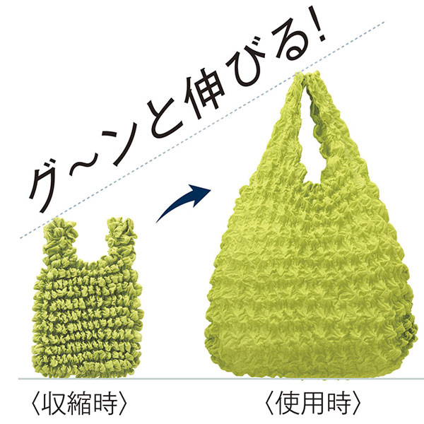 持ち歩きやすい手のひらサイズ。コンパクトだけど、物を入れるとびよーんと伸びてたくさん入るユニークなエコバッグです。
