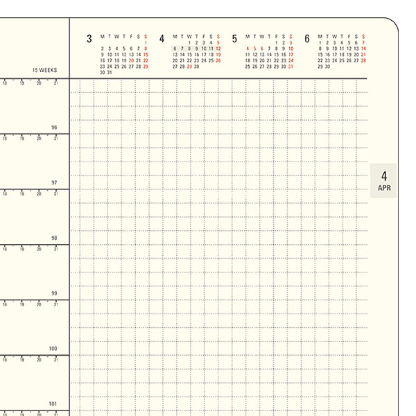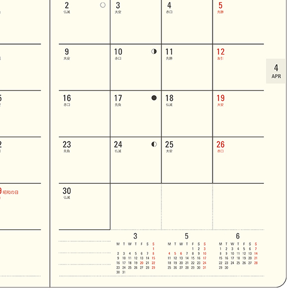 月間予定表には前月・翌月・翌々月の、週間予定表には前月・当月・翌月・翌々月のミニカレンダーがついています。