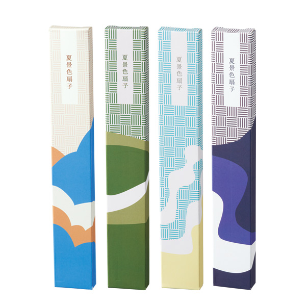夏の雲の中を突き抜けていく飛行機・波打ち際、穏やかな山間、花火と夜空をイメージした4柄。