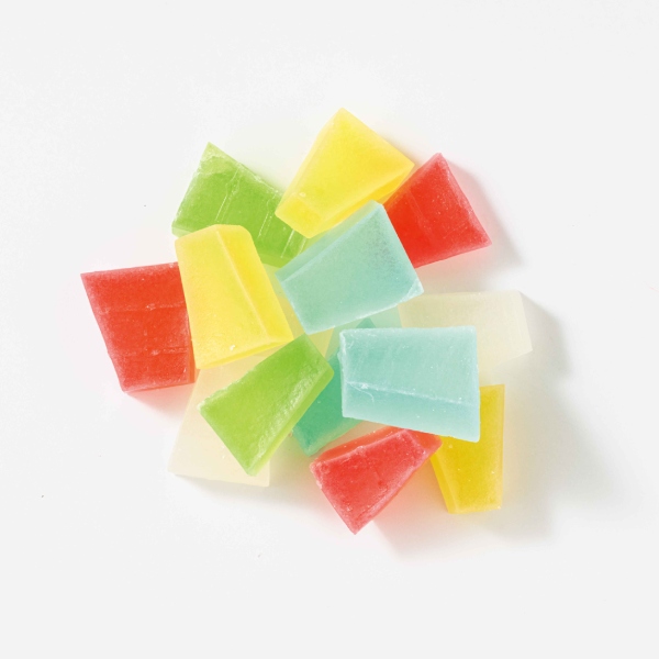 外は薄氷のようにシャリっと、中はプルンとした、爽やかで口どけの良い琥珀糖です。