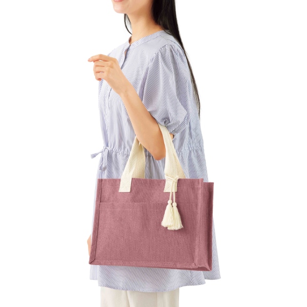 ジュート素材に、やさしい色合いと生成りハンドルを組み合わせ、上品で親しみやすい印象です。