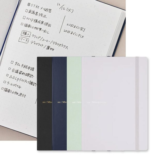 - ■材質: 表紙/(ブラック・ミントグリーン)PVCくるみ・(ライトグレー・ネイビー)紙くるみ、本文/筆記用紙90g/平方メートル
