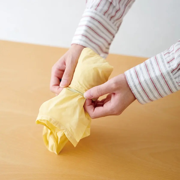 使い終わったら畳まずにくしゃっと簡単に収納でき、付属の袋に入れると約直径8センチの手のひらサイズになります。