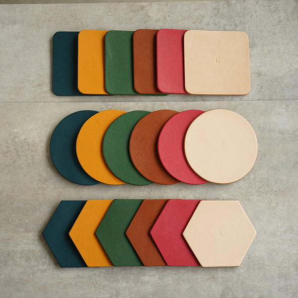 (左から)ネイビー、イエロー、グリーン、ブラウン、チェリーピンク、ナチュラル(※正方形は品番124043、六角形は品番124045です。)
