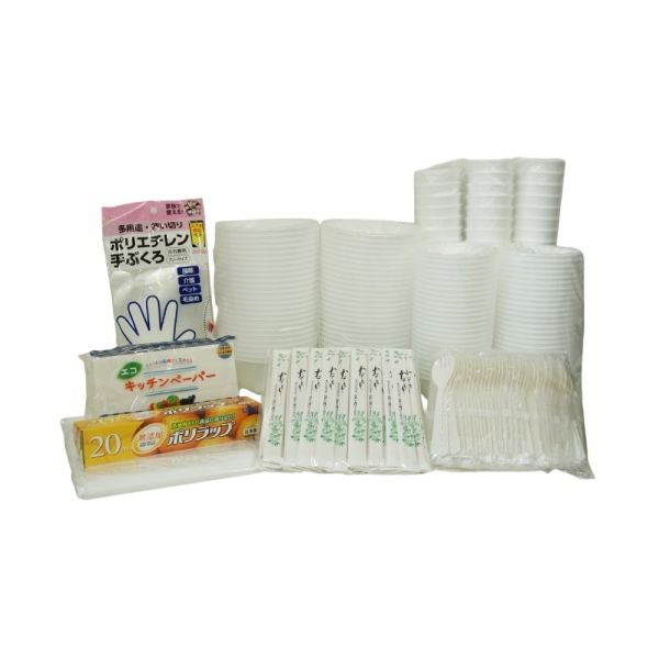 発泡どんぶり(小)(直径122×67.7mm)×50個、発泡どんぶり(大)(直径158×67.7mm)×50個、エスレンカップ(直径75×84mm)×50個、フォークスプーン×50本、割りばし(完封)×50膳、ポリエチレン手袋110枚入、ラップ(22cm×20m)、ゴミ袋45L(厚手)×10枚、エコキッチンペーパー50枚入