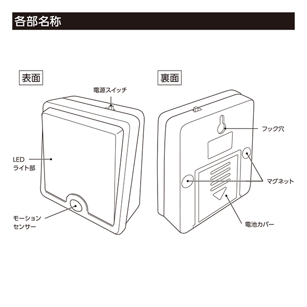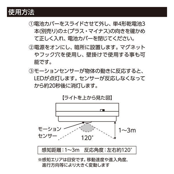スイッチをONにした状態で暗い場所にセットしておき、人感センサーが反応すると自動でLEDが点灯する仕様。