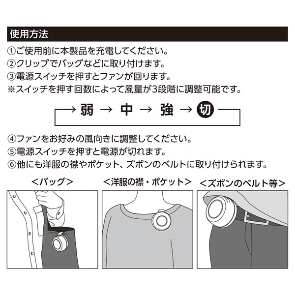 軽量で持ち運びやすいコンパクトなサイズ感でクリップで取り付けられます。