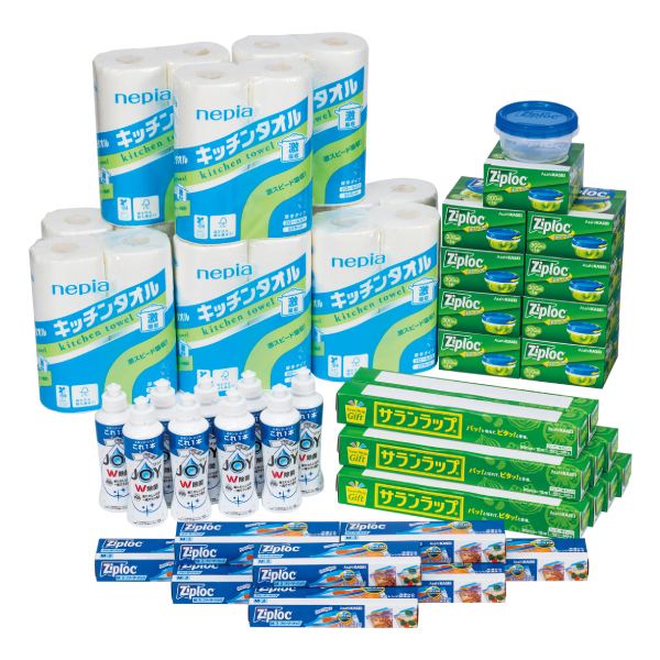 ラップや保存バッグ、食器用洗剤、キッチンタオルなど調理や片付けに役立つ便利なアイテムをワンパックにいたしました。