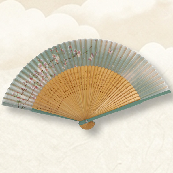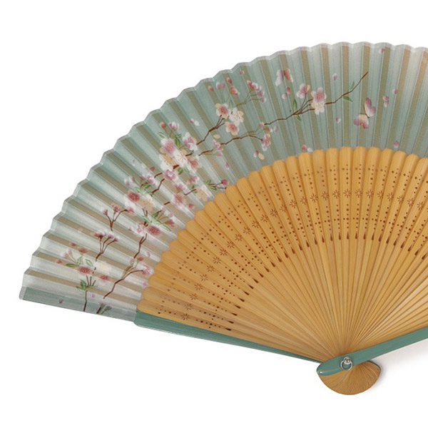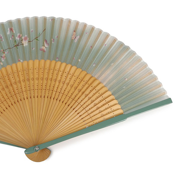 品番:124341 婦人用シルク扇子 蝶と桜の調べ 短地 翡翠