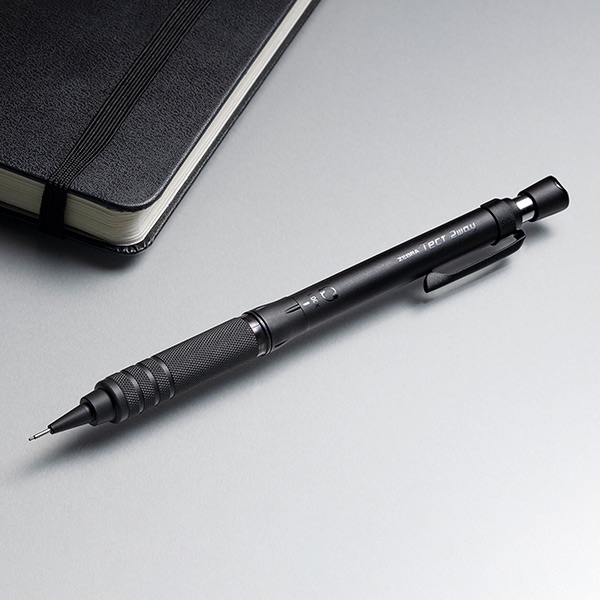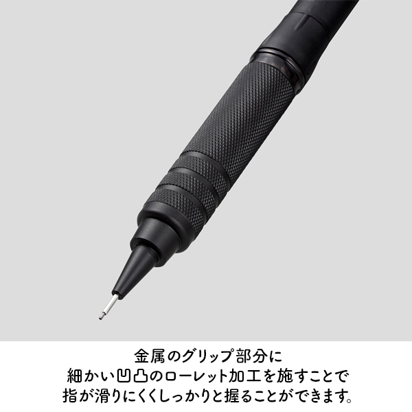 金属製ローレットグリップが指にしっかりフィットし、長時間の筆記でも指が痛くなりにくい設計に。