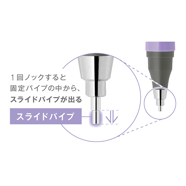 1回ノックするとパイプの長さがノックする前と比較し2倍以上になり、従来品と比べて約1.5倍書いている文字が見えやすい設計に。