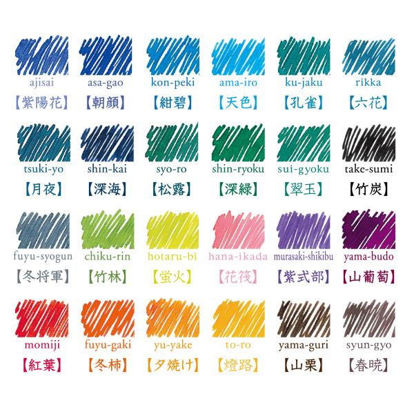 アジサイ(紫陽花)、アサガオ(朝顔)、コンペキ(紺碧)、アマイロ(天色)、クジャク(孔雀)、リッカ(六花)、ツキヨ(月夜)、シンカイ(深海)、ショウロ(松露)、シンリョク(深緑)、スイギョク(翠玉)、タケスミ(竹炭)、フユショウグン(冬将軍)、チクリン(竹林)、ホタルビ(蛍火)、ハナイカダ(花筏)、ムラサキシキブ(紫式部)、ヤマブドウ(山葡萄)、モミジ(紅葉)、フユガキ(冬柿)、ユウヤケ(夕焼け)、トウロ(燈路)、ヤマグリ(山栗)、シュンギョウ(春暁)(全24色)