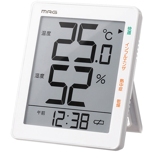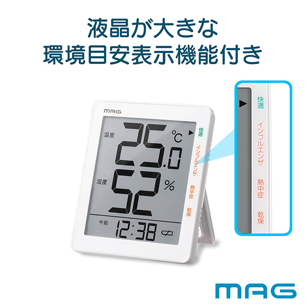室内の温度湿度から「快適・インフルエンザ・熱中症・乾燥」を注意マークでお知らせする環境目安表示機能付き。