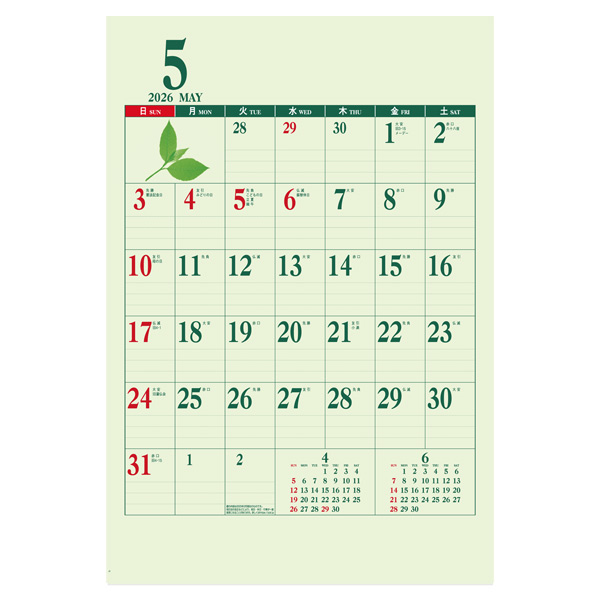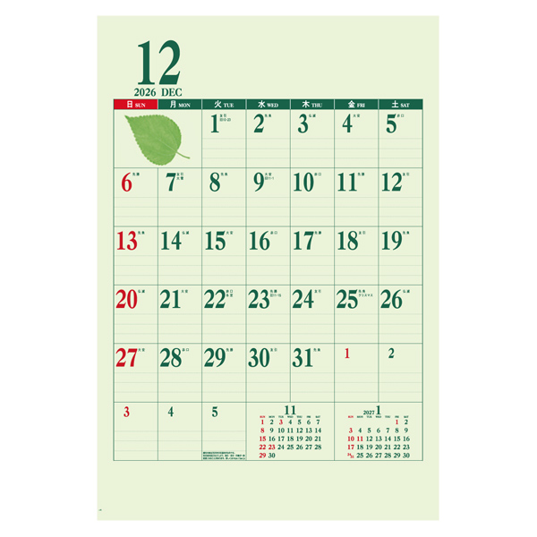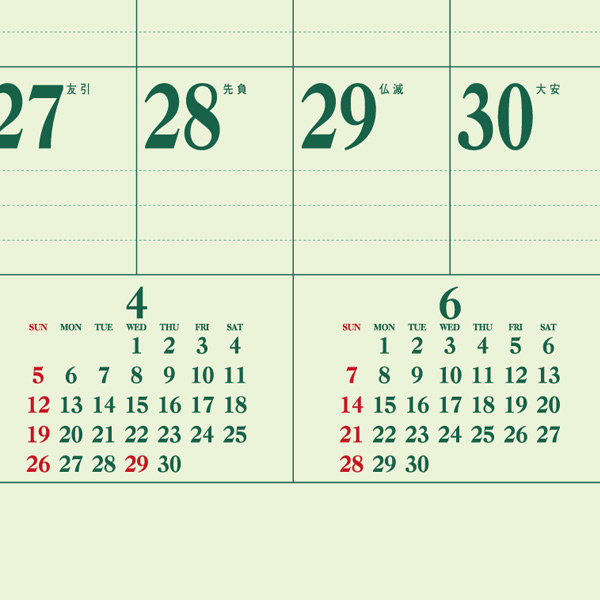 癒やしのカラー、グリーンを基調としたシンプルなジャンボ文字月表カレンダー