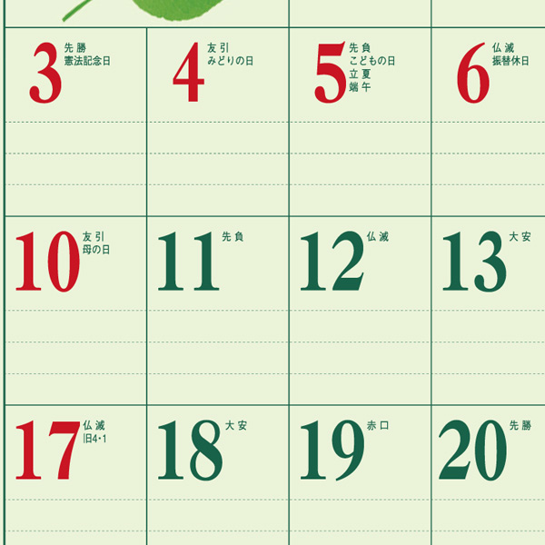 全体をグリーンを基調にデザインしたシンプルな文字月表。