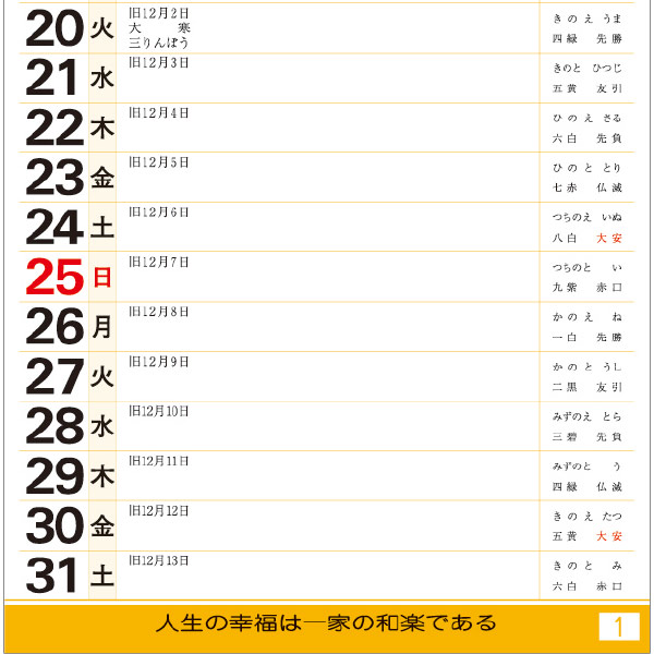 旧暦をはじめ、二十四節気、雑節、行事など、生活に必要な知識が満載。広くとったメモ欄も大変使い易いと好評です。