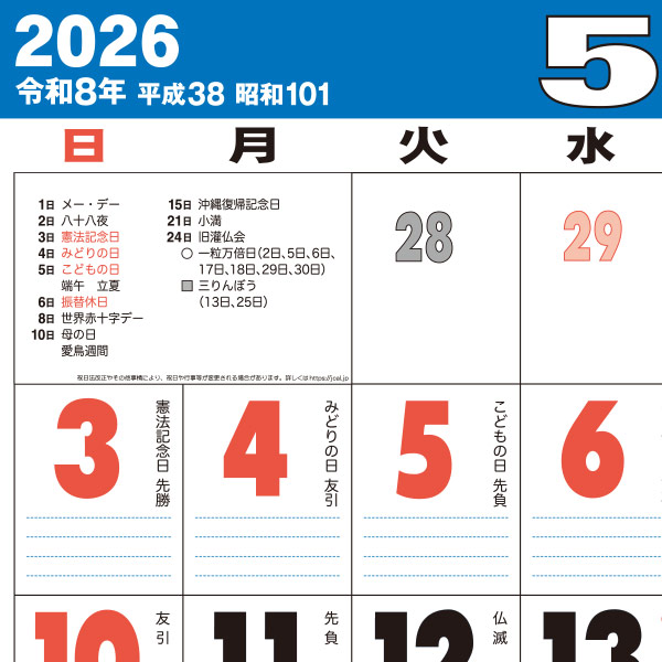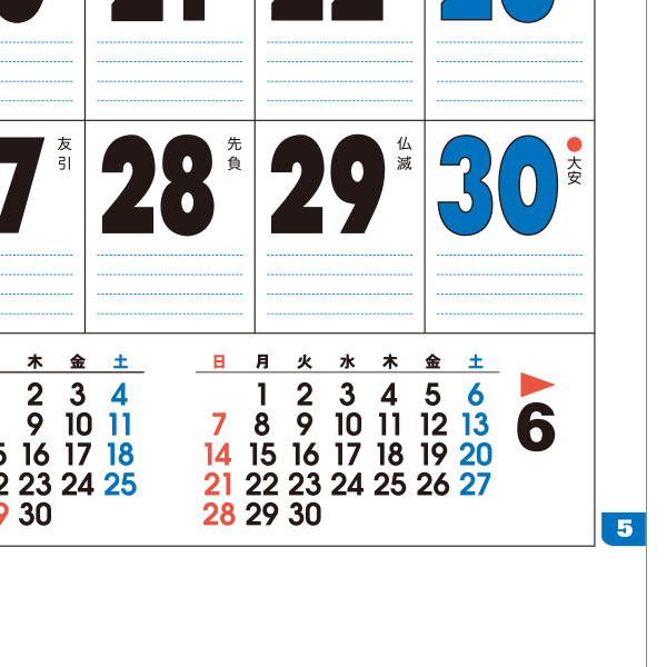 (6)多くの5週間表示カレンダーは6週目の数字が小さく見づらいレイアウトでした。