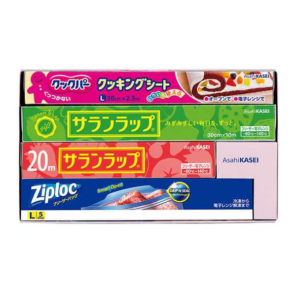【セット内容】サランラップ(30cm×10m)・サランラップ(22cm×20m)・ジップロックフリーザーバッグ(L5枚入)・クックパークッキングシート(30cm×2.5m)×1個