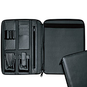 左側はペン、印鑑、電卓、小物収納スペースを配置し、さらに3階層の書類収納マチ付、右側はフラットな筆記面を確保、さらにレポート用紙5冊分を収納してもチャックがしまります。