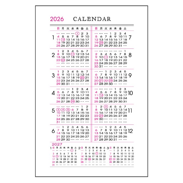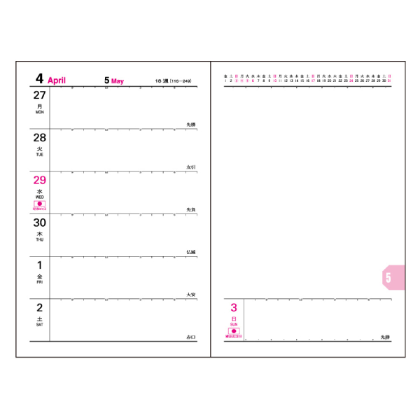 ◆カレンダー、年間スケジュール、月間スケジュール(翌年4月まで)、週間スケジュール、ノート(17頁)、おぼえ