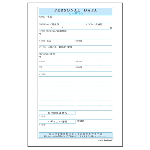コンパクトなアドレス帳は便利な分別式。11ページで55名分の情報を書き込むことができます。