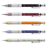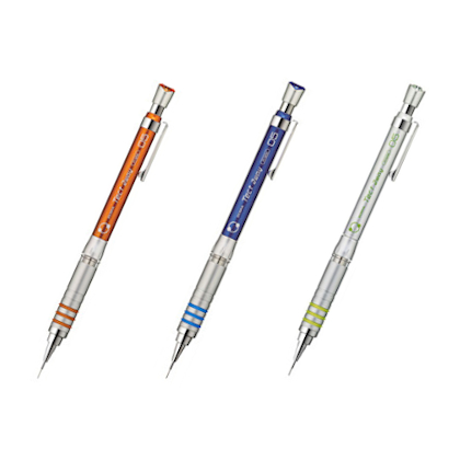 フリシャ機能ON、軸中央を右へ回すと振るだけで芯が出る。フリシャ機能OFF、軸中央を左へ回すと軸内部の重りが固定され、低重心で安定筆記。振っても芯が出ないので、通常のシャープ同様、ノックしてご使用ください。