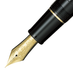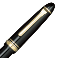 - ■材質: ペン先/21金、24金メッキ仕上げ、大型、蓋・胴・大先/PMMA樹脂(ブラック)、金属部分/24金メッキ仕上げ