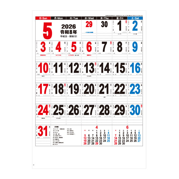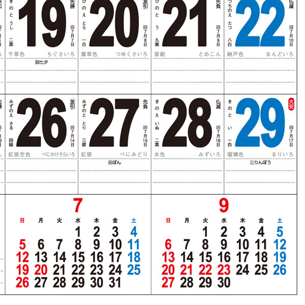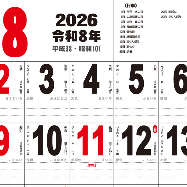 ・「大安」「友引」等の六曜が一目でわかるように表記。