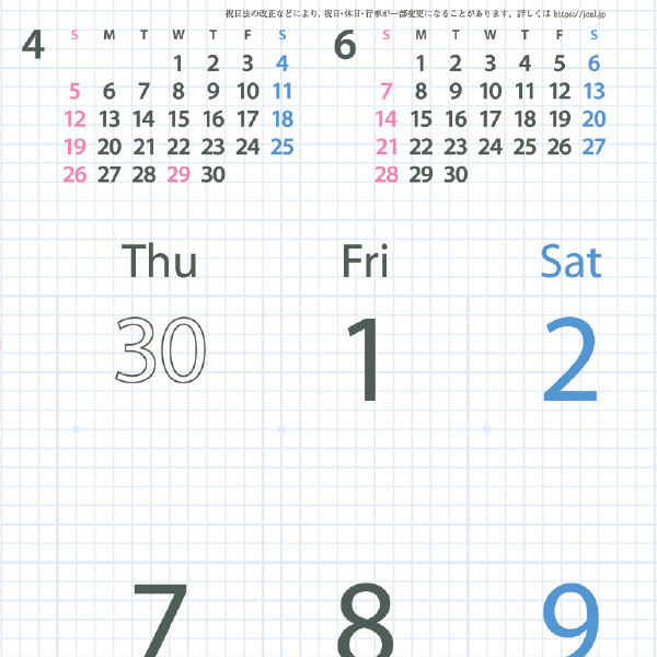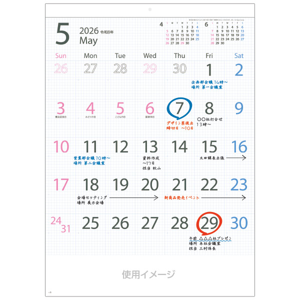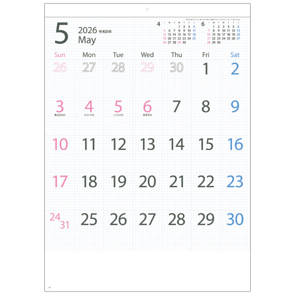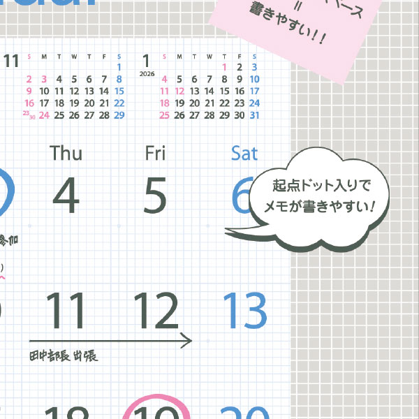 カレンダーのバックに薄い青色の「マス目」を施していますので、書き込みやすく、予定を入れるラインも引きやすくなっています。