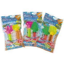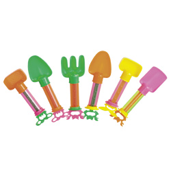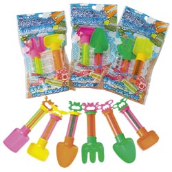 砂場で遊ぶスコップやフォーク型の水鉄砲。