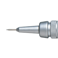 定規をあてやすい4mm先端パイプ。手のすべりを防ぐローレット加工。芯の硬度が使い分けできる表示窓付き。