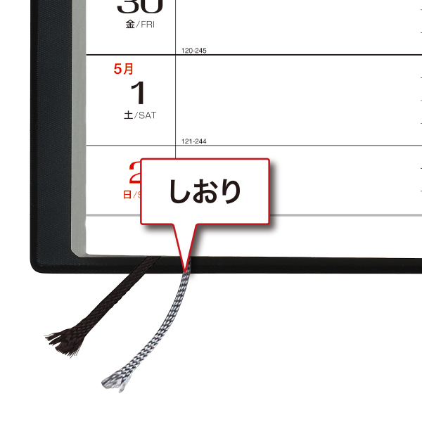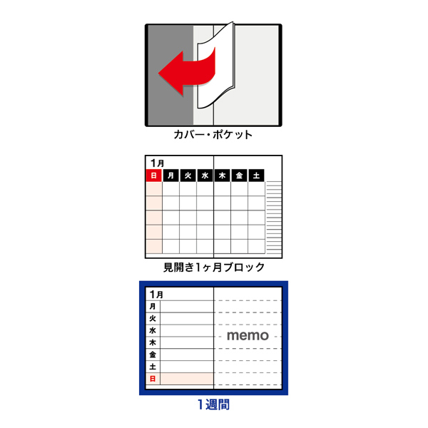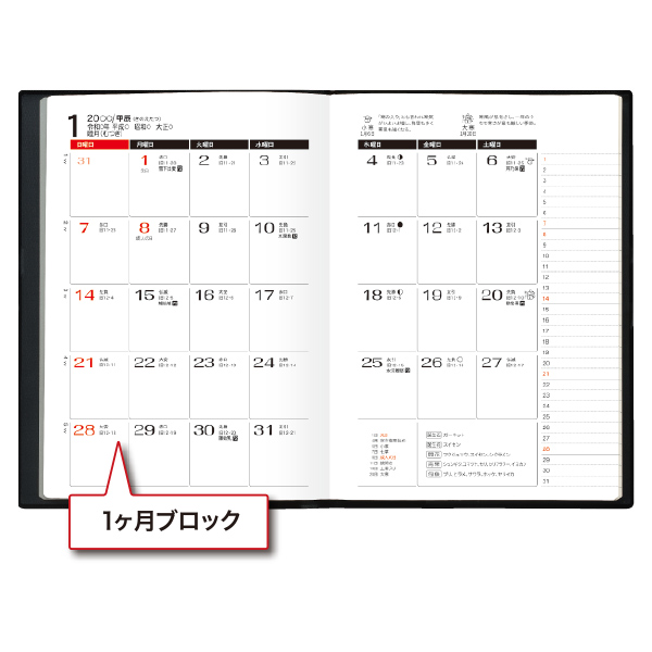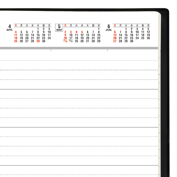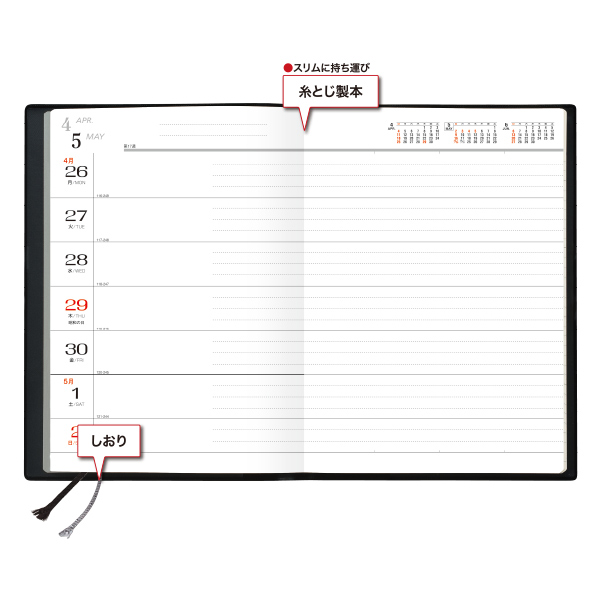 ◆176頁、糸とじ製本、本文2色、見開き1週間、月曜始まり、5段組は日曜始まり。