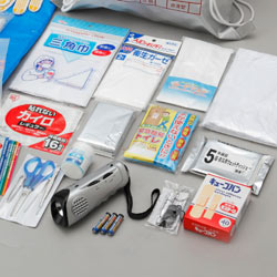 非常袋、非常用給水バッグ5L、すべり止め手袋、ゴミ袋45L(10枚)半透明、ラジオライト、単4マンガン電池3本、防災用ウエットティッシュ20枚、防寒シート、タオル200匁、救急絆創膏2サイズ40枚入、ホイッスル、ブルーシート2畳用、三角巾、マスク1枚、カイロ、緊急簡易トイレ、ハサミ、ピンセット、耳かき、毛抜き、ガーゼ、伸縮包帯、防災ガイド