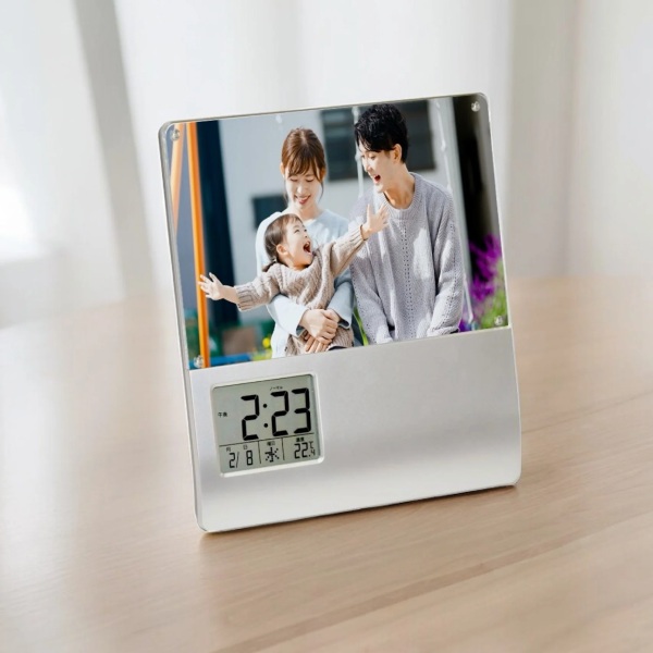 フォトフレームだけだと物足りないなと感じた方にピッタリ。デジタル時計も付いて実用的です。
