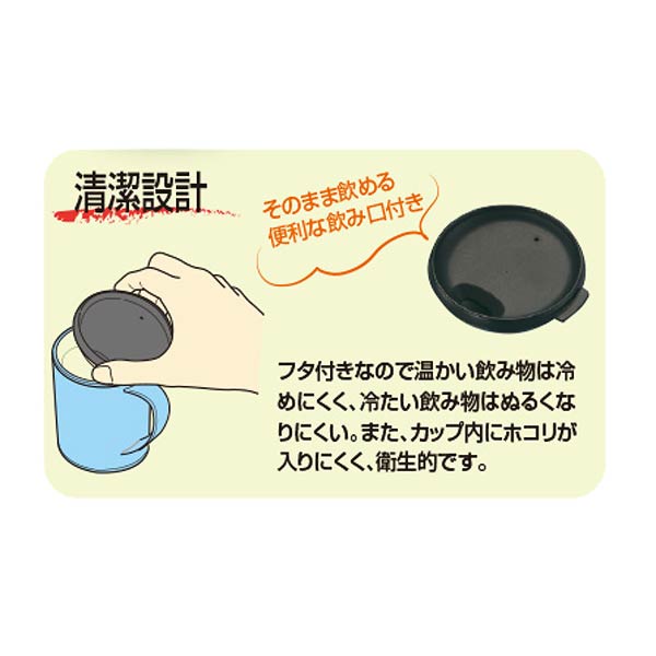 フタ付きですので飲み物の適温を保ち、中身が溢れる心配もなく衛生面でも安心です。