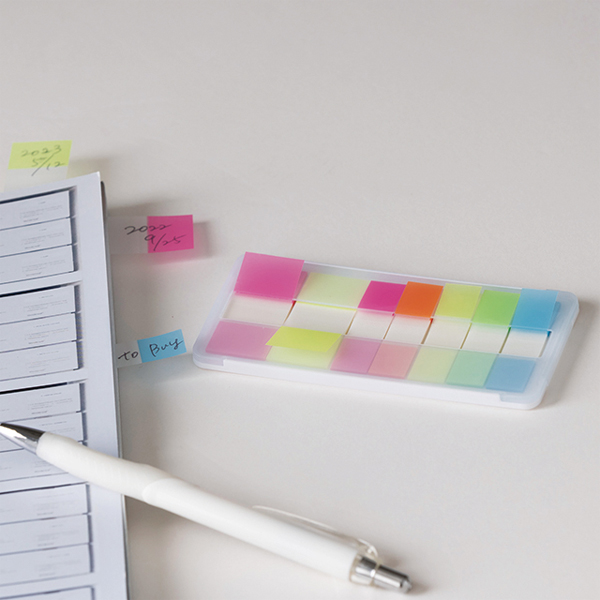 - フィルム付箋なので紙と比べ破れにくく、使いやすいです。2つのサイズがまとめて入っているので、用途に合わせて使い分けができます。