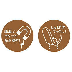 マグネットで簡単に取り付けできるから、鉄板入りのしっぽを曲げれば、冷蔵庫・ドア・ホワイトボードなどにペタッと貼って鍵や小物を掛けられます。