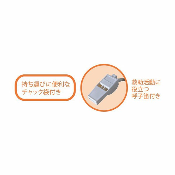| 材質: | 本体/アルミ蒸着ポリエステルフィルム、呼子笛/ABS、ひも/ナイロン、チャック袋/PE |